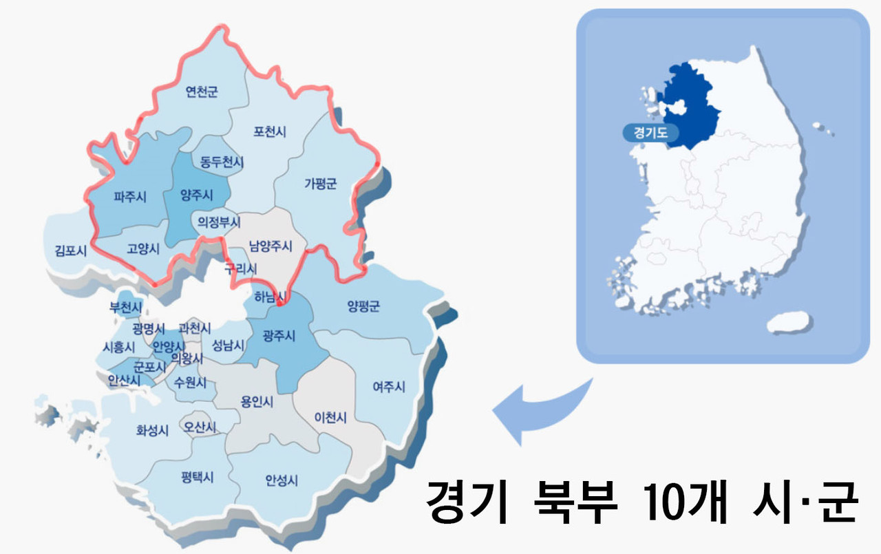 경기도는 우수한 인적자원과 풍부한 역사와 문화, 관광자원 등의 무한한 성장잠재력을 갖추고 있는 지역입니다. 경기북부의 경우 인구수는 360만명, 경기도 전체의 25.8%를 차지, 전국에서 3위에 달하는 우수 인적지원을 보유하고 있습니다. 또, 경기도 전체면적의 42%를 차지하여 개발 잠재력이 무궁무진합니다. 분단지역, DMZ, 접경지역 등 평화를 상징하는 글로벌 랜드마크 가능성을 보유하고 있으며, 풍부한 토지와 생태환경이 잘 보전되어 관광자원으로써 변화와 발전의 기회가 풍부한 지역입니다.