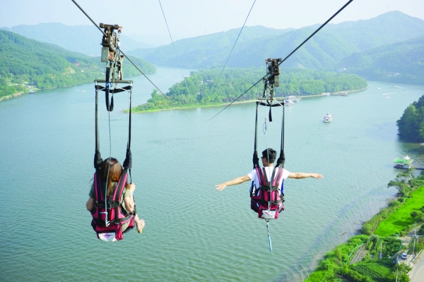 춘천 가볼만한곳 아홉번째, 의암호 스카이워크는 환상적인 호수와 산의 경관이 멋지게 어우러진 경관을 감상할 수 있는 곳으로 높이 82.5m, 길이 200m 규모의 철근과 유리로 만들어졌습니다. 유리바닥을 걸으며 스릴을 느낄 수 있으며, 주변 자연경관의 아름다움을 밤에도 야경으로 감상이 가능합니다.